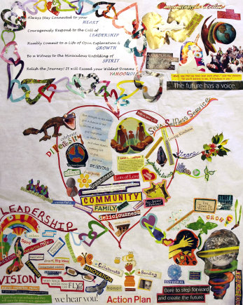 The Nine are slightly queasy to present a clear photograph of Esalen CEO Tricia McEntee’s “Vision Board.” The CEO says that her Vision Board serves as a “litmus test for pretty much every decision I make and the way I go about my job.” Her sparse collage, made over a weekend after a salsa dancing extravaganza, is new-agey feel-good.
